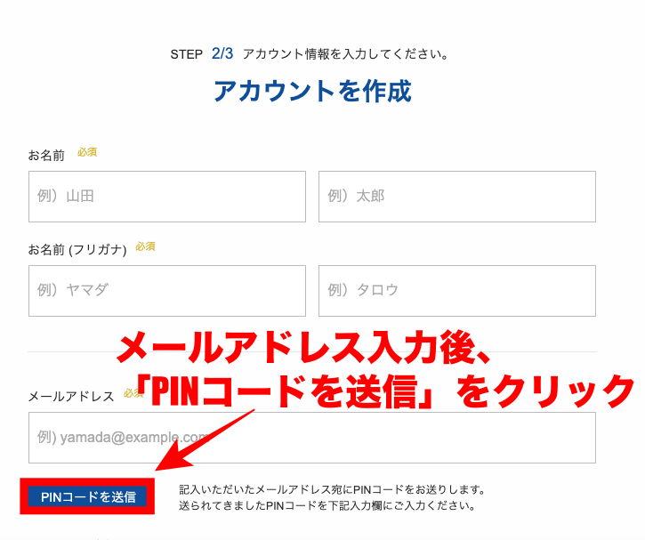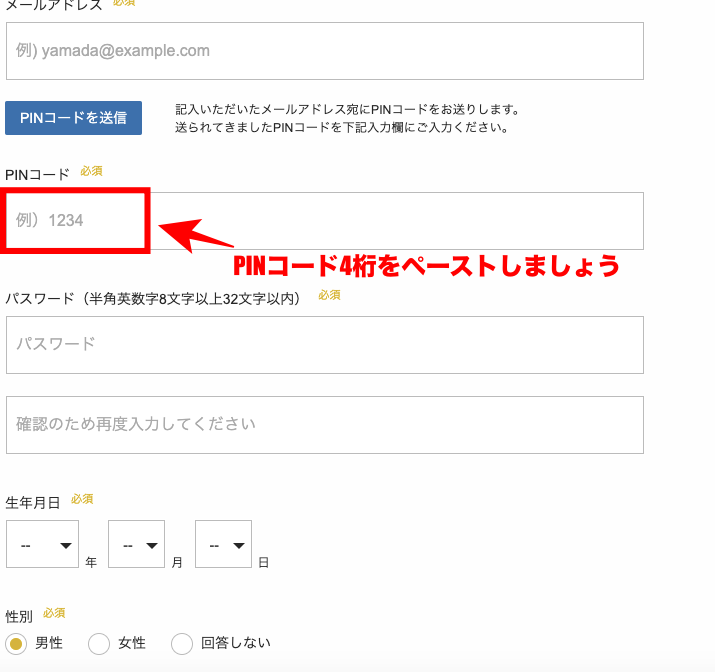 を入力後、メールアドレス宛にPINコードを受信させましょう。