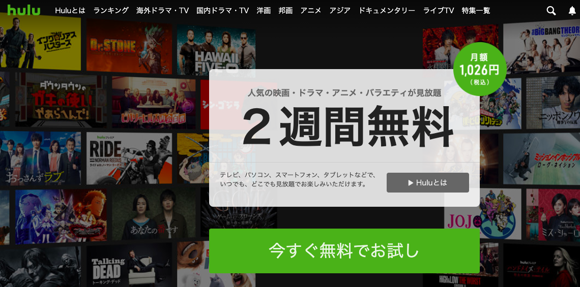 Huluは登録から2週間無料トライアルが設けられており、その期間はHuluのサービスを無料で視聴することができます。