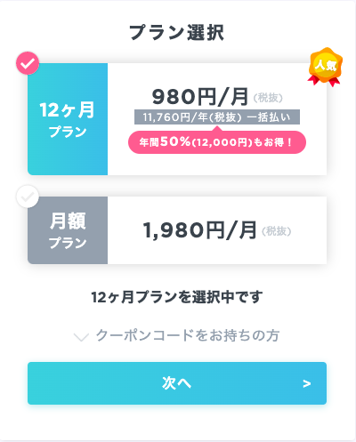 - 12ヶ月プラン 980円/月(税抜き)