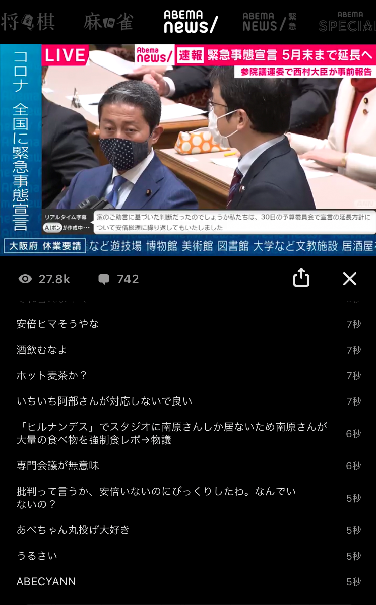 Abema TVでは放送中の動画にコメントを残したり、他の視聴者のコメントを見ながら動画を楽しむことができます!